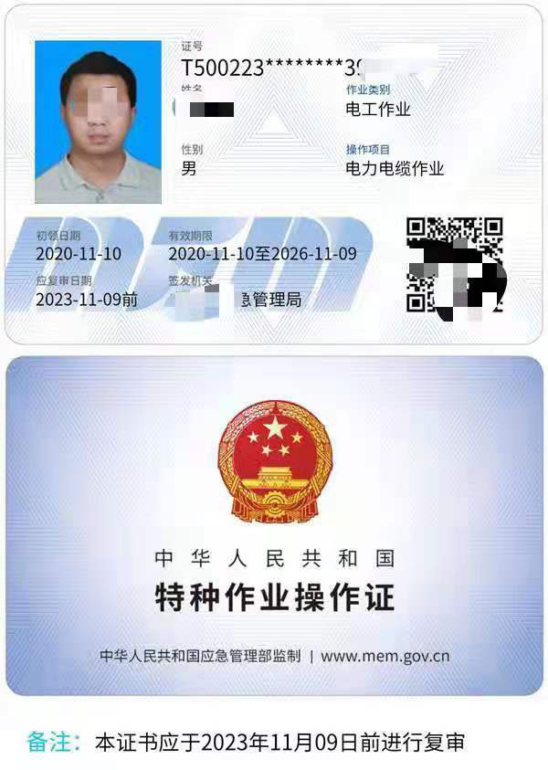 電力電纜操作證證書展示: