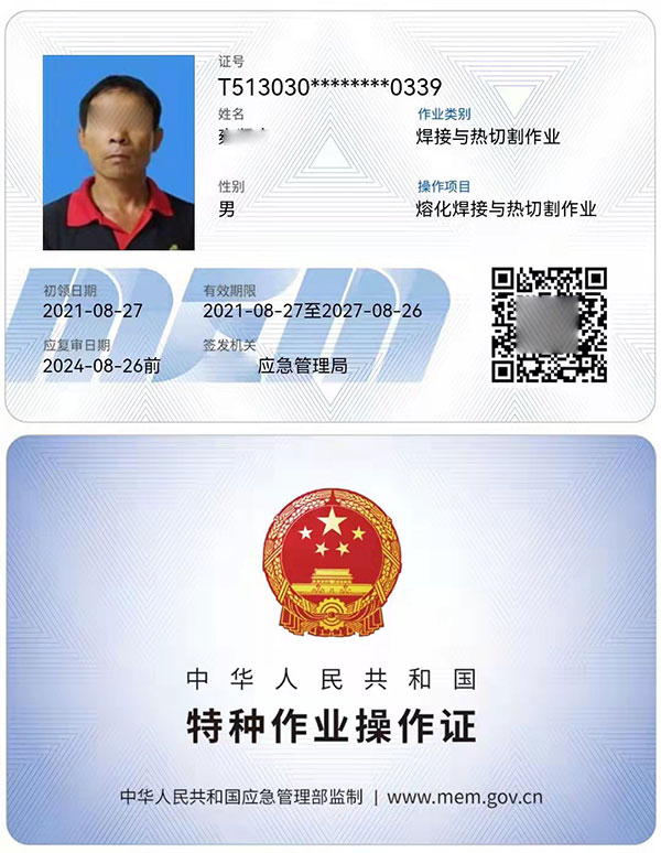 焊工證分為好幾種,上崗常用的屬于焊工特種作業(yè)操作證,是原安監(jiān)局(現(xiàn)在的應(yīng)急管理局)頒發(fā)的證件,證件全國(guó)通用、聯(lián)網(wǎng)可查,類似于身份證樣式的IC卡,有效期為6年,每3年需要復(fù)審一次,6年到期需要換證,復(fù)審和換證一般需要提前2-3個(gè)月申請(qǐng),如果過期的話就視為作廢了,到時(shí)候就只能重新考!所以考了證的學(xué)員一定要記得提前復(fù)審和換證。