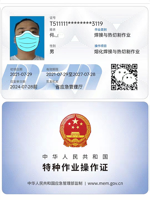 焊工證分為好幾種,上崗常用的屬于焊工特種作業操作證,是原安監局(現在的應急管理局)頒發的證件,證件全國通用、聯網可查,類似于身份證樣式的IC卡,有效期為6年,每3年需要復審一次,6年到期需要換證,復審和換證一般需要提前2-3個月申請,如果過期的話就視為作廢了,到時候就只能重新考!所以考了證的學員一定要記得提前復審和換證。