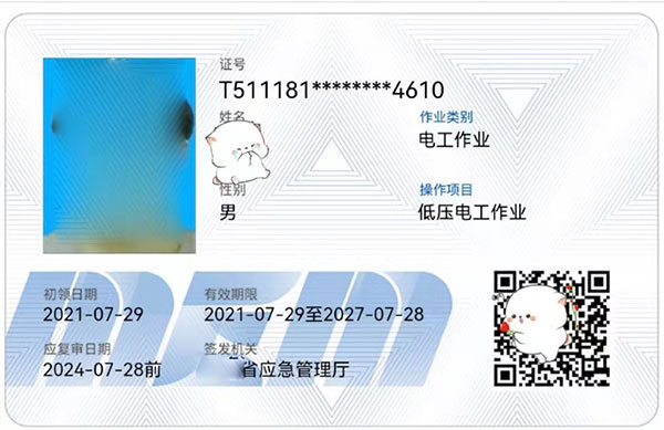 特種作業操作證: 作業種類:電工(俗稱 操作證 、 上崗證 ),分類:高壓運行維護作業、高壓安裝修造作業、低壓電工作業、安裝、維修、發電、配電。自2010年后,老版特種作業操作證( IC卡 )樣本改用二代身份證似的 IC卡 類新版中華人民共和國特種作業操作證樣本,復審為三年一審,可以用到60歲退休為止