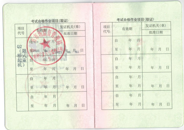 叉車證N1,電梯維修T,特種安全設備管理A,起重機指揮A,Q2起重司機(限門座式起重機),Q2起重司機(限橋式起重機),Q2起重司機(限門式起重機),Q2起重司機(限纜索式起重機),Q2起重司機(限塔式起重機),Q2起重司機(限流動式起重機),Q2起重司機(限升降機),觀光和觀光列出司機,鍋爐壓力容器壓力管道管理A,電梯管理A,起重機械管理A,場(廠)內專用機動車輛管理A,工業鍋爐司爐G1,電站鍋爐司爐G2,鍋爐水處理G3,快開門式壓力容器操作R1,移動式壓力容器充裝R2,